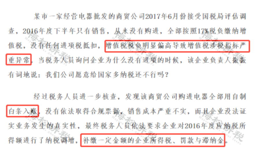2、該企業采用自制的白條入賬,這些不合規的發票是不能在企業所得稅前扣除的,所以稅務機關讓企業進行應納稅所得額調整處理,補交企業所得稅。