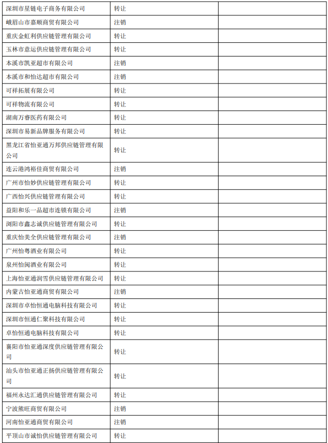 大家都注意到,近三年來,怡亞通頻繁轉讓或注銷公司,比如化妝品、超市、商貿以及供應鏈公司,涉及企業(yè)數量多達85家,如河南怡亞通化妝品有限公司、湖南怡亞通梧桐國際美妝有限公司、江西怡亞通國際美妝有限公司等均已被注銷。