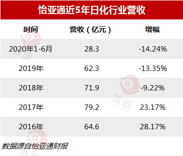狂攬全國各地知名化妝品代理商,2016-2017年怡亞通的日化業(yè)務交上了一份亮眼成績單。財報顯示,2017年怡亞通日化業(yè)務營收達79.2億元,同比增長23.17%。而這,也成為了怡亞通日化業(yè)績的高光時刻,此后幾年收入連年萎縮,2019年其日化收入已倒退至2016年的水平。