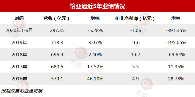 2017年是怡亞通成立的第20個年頭,這一年公司營收達680.6億元,延續(xù)了上一年的增長勢頭,此時的扣非凈利潤也比較穩(wěn)健,同比增長11.35%。然而,2018年至今,公司業(yè)績可謂是每況愈下,2019年和今年上半年扣非凈利潤均為負值。這一業(yè)績逆轉與上述日化業(yè)務、380分銷平臺業(yè)務收入的變化恰好吻合。