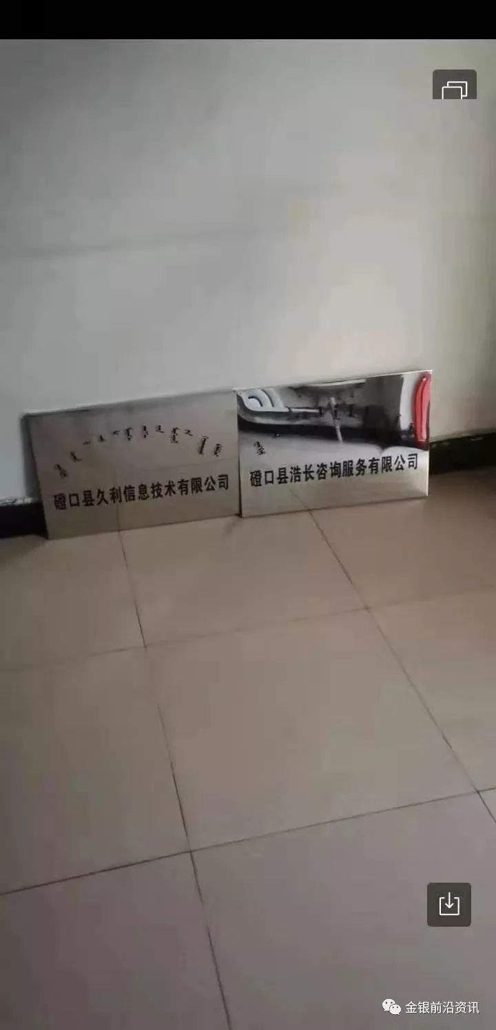 空曠的房間里,孤獨的擺放著兩個牌子“磴口縣久利信息技術有限公司” 和“磴口縣浩長咨詢服務有限公司”,如同被遺棄。詢問房東一番,得知該房屋為半個月前剛租的,租金3000元/年,前面是門頭,后面就是房東住所。